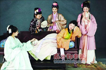 小宝琴(左一)、小湘云(横卧者)、香菱跟姐妹们在一起。