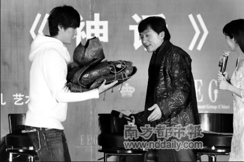 这次被成龙亲自钦点扮演男一号,胡歌非常激动。现场他也非常落力地在大哥面前表现,不仅与白冰合唱了一首《神话》, 还当着成龙的面表示,自己演翻版孟将军压力很大,但会尽量学习大哥演技“无限度地接近成龙”,说得成龙开心不已,亲自将当年拍摄电影穿的一套价值百万的盔甲送给胡歌。当年由金喜善扮演的女一号却通过网络海选最终决出。在描述自己心中理想的女主角时,唐季礼连连用了“兰心慧质,闭月羞花……”等几近完美的词来形容,倒是有记者直接问到他有无打算请绯闻女友林心如来演时,他则不得不尴尬地回应“也可以吧”随后赶紧转移话题。