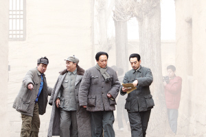 连续两天下雪,怀柔影视基地也一片银装素裹。记者进入拍摄现场时,工作人员一再叮嘱,一定要跺跺脚再进去,免得在刚刚打扫好的通道上再踩上雪。而这个通道,就是片中毛泽东、周恩来、朱德等众多人物步入七届二中全会会场的通道。