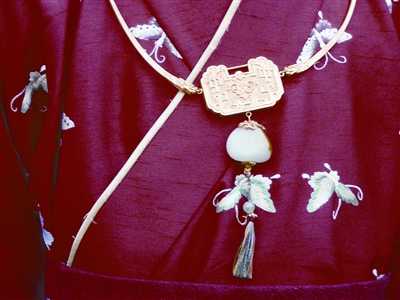 黛玉着绿,宝钗穿白,近距离打量,大概是拍了大半年了的缘故,衣服都有些旧了。宝玉胸口那块通灵宝玉据说是很贵的,于小彤介绍说是羊脂玉,仔细打量,上面居然还刻着“通灵宝玉”四个字,顿时把我看傻了:不是应该刻“莫失莫忘,仙寿恒昌”吗?