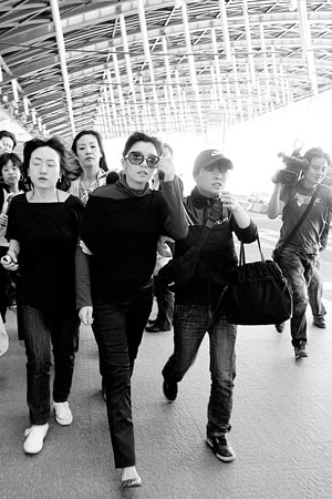 等贾静雯一走出通道,媒体立即蜂拥而上。其内地经纪公司委派的两名助理,立即上前将其左右护住。