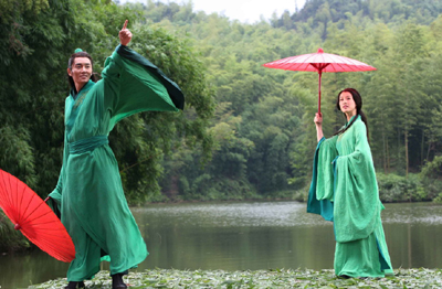 根据网友提供的地址,新民网观看了这则长达4分半的广告。广告采用了音乐mv的形式,黄圣依和李元身着绿色薄纱,手擎走伞,时而在竹林上空缓缓飞过,时而在水面上表演“蜻蜓点水”。