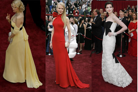本届奥斯卡,蝴蝶结似乎是潮流指标,女星都把自己当“礼物”打扮。澳大利亚女星妮可基曼(Nicole Kidman,中图)和已有四个月身孕的好友娜奥米·沃茨(Naomi Watts,左图),一红一黄,是两大娇点,妮可基曼的大红蝴蝶结与华人新年最应景。《穿着Prada的恶魔》的女主角安妮·海瑟薇(Anne Hathaway)前后都“打结”(右图)。