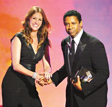 当天的颁奖礼可谓星光熠熠,多位曾与她合作的影坛名人均有出席,包括布鲁斯·威利斯、汤姆·汉克斯、娜塔丽·波特曼及丹泽尔·华盛顿等,当中丹泽尔更负责把荣誉大奖颁发给茱莉亚。汤姆·汉克斯介绍茱莉亚时强调说:“每一个人都爱茱莉亚·罗伯茨,每一个人、每一个人、每一个人。”