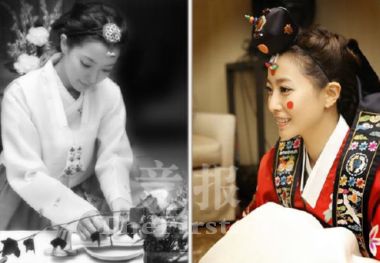 金喜善27日在自己的迷你主页上公开的这张相片中身穿韩国传统新娘礼服,脸上印着胭脂印记的金喜善满脸都是幸福的微笑,金喜善在发布这张相片时也不忘向给自己买这身衣服的婆婆表示了谢意。