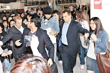 Rain全程笑容满面,不时向Fans挥手,态度亲切。当众人走近职员通道闸口时,Rain突然脱去外套,露出健硕手臂,令现场Fans尖叫声四起!入闸前,Rain再次转身挥手向Fans道别,Fans留在闸口前大喊偶像名字,目送他离开。