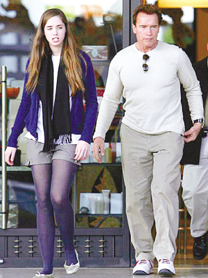 施瓦辛格16岁的女儿克里斯蒂娜日前在纽约与父亲一同外出购物,虽然只有16岁,但身材高挑的她个头几乎与明星老爸肩并肩了。