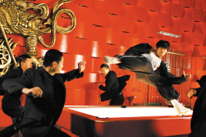 周杰伦在《功夫灌篮》中身怀百般绝技,满分射篮轻而易举,踩花式单车头头是道,就连打架亦百战百胜。戏里其中一场讲述他为了伸张正义营救被挟持的友人,单独踩上“红花会”内与八十名壮汉恶斗,周董不但起飞脚出铁拳,还使出李小龙经典绝招双节棍,充满狠劲。动作导演程小东更大赞周董武打功底好。