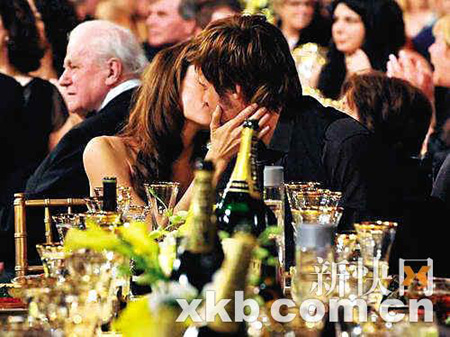 2008年1月27日,第14届美国演员工会奖(SAG)在洛杉矶举行酒会。穿一袭抹胸礼服的安吉丽娜·朱莉与布拉德·皮特甜蜜亮相,两人十指紧扣步入会场,席间不时私语,情到浓时更当场幸福拥吻,浓情蜜意羡煞旁人。