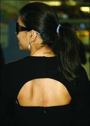爱的文身,这一招早就不新鲜了。不过,在三级片、性丑闻这样的阴影之下,“疯狂主妇”伊娃还是使出了这一招,文的是她球星老公托尼的球衣号码9(NINE)。最近她和辣妹维多利亚走得很近,估计是偷学了一招。