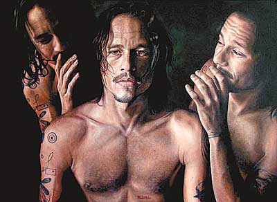 希斯•莱杰生前与好友Vincent Fantauzzo计划打造一幅自己的肖像。据后者透露,在这幅由他完成、取名为“希斯”的肖像画中,中间占主导地位的“希斯•莱杰”面目茫然,旁边两个“希斯•莱杰”正在他耳边低语。(张明天)