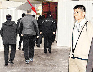 陈冠希(箭头所指)进出香港警署都有众多私人保镖前后簇拥。