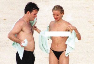 照片中的两人在沙滩上嬉戏的情景完全暴露在记者的胶片下,迪亚兹当时只穿着黑色T-Back内裤,上半身则一览无余。