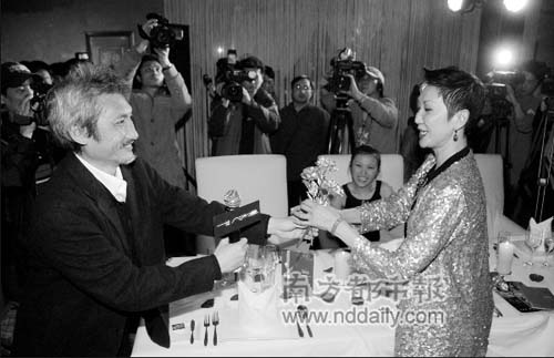 徐克则把金色玫瑰转送给了施南生(右)。