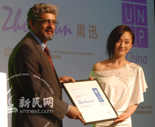 2008年4月22日,新民网记者从周迅经纪公司华谊了解到,周迅被联合国开发计划署任命为中国首位亲善大使,将与罗纳尔多、齐达内和莎拉波娃等体育明星在各自领域从事慈善、环保工作。任命仪式上,周迅表示,为了呼吁环保,她将不再泡澡。