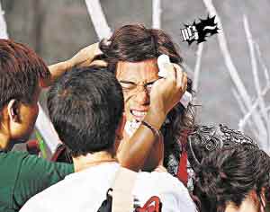郭富城中招后,工作人员即时处理,他痛得呲牙咧嘴。