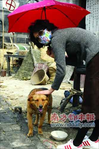 戴上口罩防烟熏,逗逗小狗演员玩权当放松。