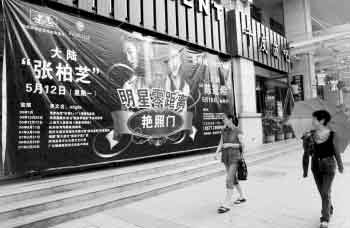 记者核实:昨天下午2点多,记者在江滨路新时代影院楼下的千度酒吧门口看到了吴先生说的广告。在千度酒吧门口右侧的一副海报上,写着“大陆张柏芝”、“大陆陈冠希”以及两人的真名和相关简介,中间显要位置是两人照片和“明星零距离”、“艳照门”字样。许多路人从海报前经过都不禁瞄上一眼。