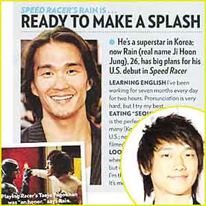 美国演员卡尔·杨最近是春风得意,刚刚主演了沃卓斯基导演的《极速赛车手》不说,还“错误地”登上了美国著名的《人物》杂志。《人物》杂志的编辑把卡尔·杨误认为是韩国明星Rain,在照片边上还配了一段文字:“他在韩国是鼎鼎大名的超级巨星,本名叫郑智熏,粉丝们都称他‘Rain’,《极速赛车手》是他投身好莱坞的第一步。” 微特