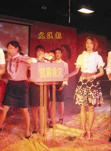 中新网5月21日电 据香港文汇报道,昨日在唐山出席活动的郭可盈,在活动中提议加插一项四川募捐行动环节,在场人士无不赞成,每位来宾也很踊跃捐献。