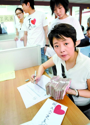 前天,从宁波外景地直接赶回北京的著名演员张瑜,从北京机场直接来到中国扶贫基金会,为汶川灾区的孩子们再捐10万元善款。和张瑜一道同来的还有张瑜导演的电影《八十一格》的两位青年主演王丽坤和王睿。张瑜说,10万元对灾区人们来说,也许是杯水车薪,但现在灾区孩子需要的不仅仅是钱,他们更需要心灵医治和抚慰。