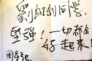 四川地震之后,不少幸存同胞心灵遭受了巨大的创伤,25日,记者带着周星驰、邰正宵、张萌等明星的亲笔书信来到了刘虹利的病房。当周星驰、邰正宵等明星的亲笔信交到虹利手中时,她露出了多日来难得的笑容,嘴里反复说着:“真没想到明星会给我写信。”而周星驰正是她喜欢的电影演员之一。 胡 蓉