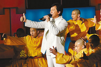 中新网6月5日电 成龙昨晚现身湖南卫视《快乐大本营》的现场,录制大型慈善晚会《童看奥运.共享光明》。在节目最后,成龙为弱势儿童募款,并以一首合唱的机会拍卖自己的歌声,最后一位女士以148万的慈善高价“买”到。