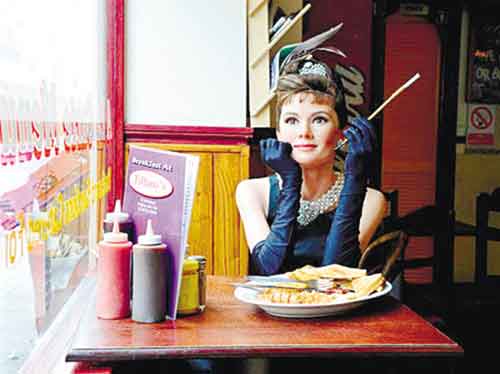 奥黛丽·赫本蜡像再现<蒂凡尼的早餐>中场景(图)