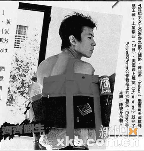 陈冠希继续留美国搞时装王国,上周美国网上杂志《Hypebeast》就登了Edison 与Porter 合作新推出的沙滩袋,陈冠希赤膊上阵亲身示范。