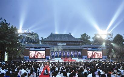 夜幕降临,典礼正式开始,荐馨殿前3米多高、20多米长的3层舞台气势非凡,舞台上10个醒目的大鼓和飘扬的战旗呈现出三国时代金戈铁马的风貌。观众的耳畔响起震天的喊杀声和咚咚战鼓,数十名披着盔甲的蜀国士兵挥舞红旗冲上台摆好军阵,这时近百名儿童念着苏轼的《赤壁怀古》从舞台上缓缓走下。之后,本土川剧演员还表演起变脸吐火,他们的脸谱尽是三国猛将,台下的吴宇森导演看得如痴如醉。值得一提的是,舞台两个大屏幕播放了10分钟的《赤壁》片花,其中很多都是当天成都上映没有呈现的部分,让影迷看了大感过瘾。