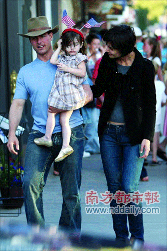 阿汤哥生于1962年7月3日,美国国庆日那天正好是他46岁生日的第二天。他一身西部牛仔装扮,抱着宝贝女儿苏瑞走在大街上,不时向围观的粉丝打招呼,也任身边的狗仔队拍照。然而,当天的明星却不是阿汤哥,而是他怀里2岁的小苏瑞。苏瑞戴着一个红色发卡,上面插着两面美国国旗,造型十分趣怪。尤其当她在明星老爸怀里挥舞双臂的时候,是街上十足的焦点人物。妈妈凯蒂一身黑衣十分低调,她不时低头跟女儿说话,有时也主动向在场的狗仔队庆祝“国庆快乐”。