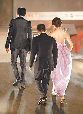 伟仔致词时还是不忘拉近与大家的距离,他说:“好久没来台湾非常兴奋,看到今天的天气就想起去年这个时候,《赤壁》剧组在大陆顶着40度高温穿厚重的衣服拍打戏,真的好热啊!”他并与其它两位男主角有默契地穿黑西装酷帅有型。