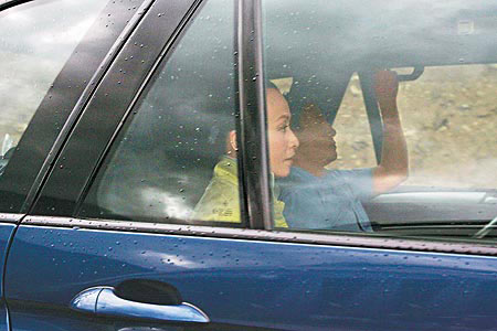 梁朝伟(后)和刘嘉玲昨晚被目击乘车上山回饭店。