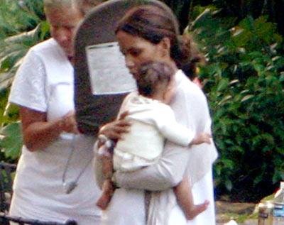 据国外媒体报道,41岁的哈莉·贝瑞上周被拍到抱着女儿娜拉出现在洛杉矶的一个公园里,哈莉·贝瑞的母亲Judith Ann也在场,不过,小娜拉的头埋在妈妈怀里,让人看不清长相。