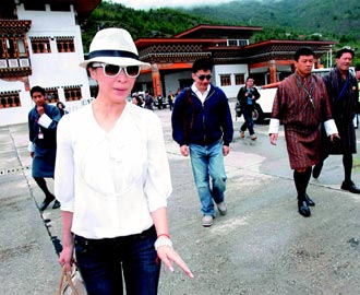 梁朝伟(右起)、刘嘉玲婚后首度在不丹露面,和林青霞大方面对镜头。