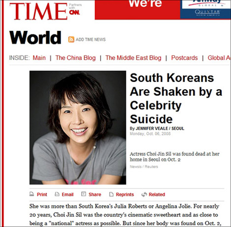 据《体育朝鲜》报道,美国《时代》杂志网络版周二(韩国时间7日)通过题为《明星的自杀震惊全体韩国人》(South Koreans Are Shaken by a Celebrity Suicide)的报道,对把崔真实逼向绝路的韩国社会所存在的问题以及崔真实之死在韩国社会引起的震动进行了集中阐述。