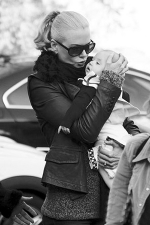 图文:妮可抱爱女亮相 不时努嘴逗女儿