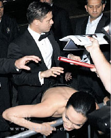 茱莉被挤倒抓栏杆求救 皮特怒视影迷(图)