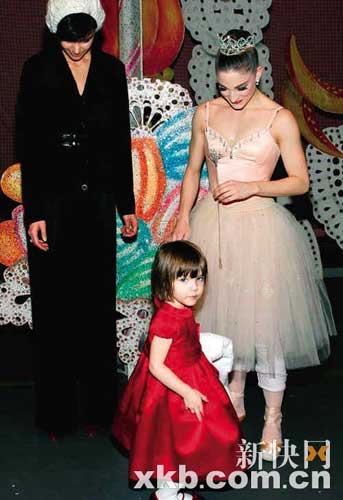 周日,凯蒂·霍尔姆斯带着打扮似小公主的苏瑞一起去纽约芭蕾舞团观看剧目《胡桃夹子》,并在后台和芭蕾舞演员合影留念。