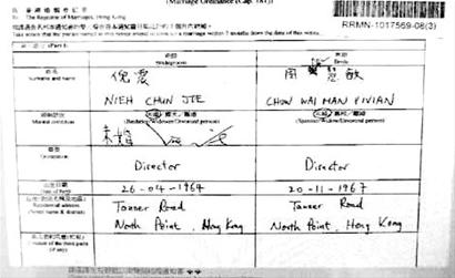 倪震发表结婚声明后,19日,香港记者在金钟婚姻登记处发现倪震和周慧敏签下的拟结婚通知书。登记处职员表示,签下通知书后男女双方最快17天以后正式成为夫妇。
