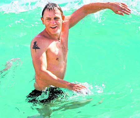 丹尼尔穿四角泳裤,与米歇尔在水中搂搂抱抱、玩亲亲,上岸后躺在沙滩仍上演007的老梗情节,他抚摸她性感身躯,热吻缠绵。他的身材较之前拍片时显得略微松垮,仍算维持得不错。