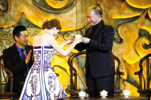 由于影片中出现众多“雷人”的台词,外界对于《赤壁(下)》的期待,已经从一部历史片演变成一部贺岁喜剧片。不知道是不是受此影响,前晚刚在北京看过《赤壁(下)》的主创们,在昨日的首映发布会上也都充满了“喜剧感”。穿一袭青花修身裙子亮相的林志玲特意在现场大秀茶艺,为各位赤壁将领沏上功夫茶,并亲手送到导演与诸位男演员手里,让一众男士感觉十分受用。而成龙大哥也前来捧场,一上台便给好友吴宇森一个熊抱,整个场面其乐融融。