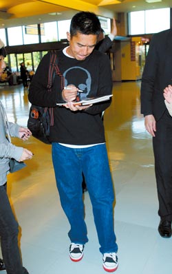 中新网1月16日电 据台湾《中国时报》报道,梁朝伟结束《赤壁:决战天下》台湾宣传行程,15日与金城武分别搭机离台。梁朝伟在机场亲切为影迷签名。