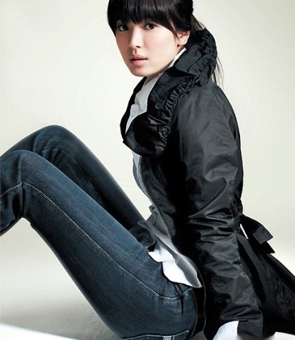 韩国女演员宋慧乔近日为某牛仔裤品牌担任代言,拍摄了一组广告照。宋慧乔精致的五官与充满着女性魅力的身材很适合这身装扮。