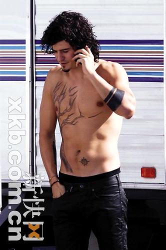 1月30日,奥兰多·布鲁姆在新片《坐拥怜悯》的片场赤膊亮相,拍摄间歇的他顶着方便面头在讲电话,胸前和手臂上的假文身清晰可见。“精灵王子”这次的造型比以往的角色都更强悍,但有些邋遢。