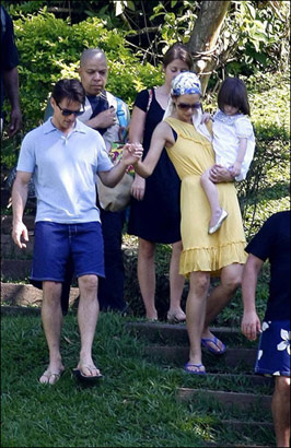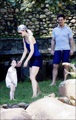 昨日(2月2日)记者拍到了在巴西尽情享受家庭生活的汤姆·克鲁斯一家。一家人沐浴在阳光下,异常幸福。阿汤哥身穿淡蓝色上衣,深蓝色短裤一改往日英挺造型,阿汤嫂则脱掉了席地长裙,穿起了露肩小背心,休闲自得,他们可爱的小女儿则一身白色连衣裙,一家人齐乐融融,羡煞旁人。