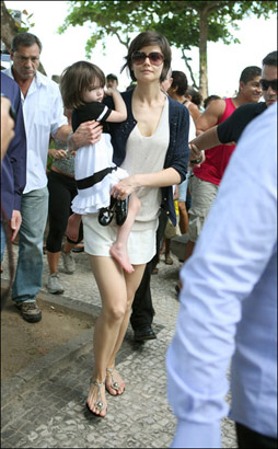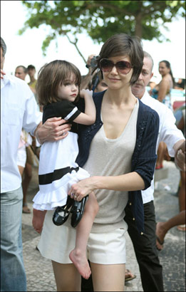 正在巴西度假的凯蒂·赫尔姆斯昨日(2月2日)带着自己可爱的小女儿在巴西的海滩上悠闲的走着,白色的短裤衬得美腿秀场,蓝色的外衣轻巧的抵挡这紫外线的困扰,半脸墨镜体现非凡气质,一双阿瑟丁·阿拉亚凉鞋提升品味,活脱脱一个高大版的芭比娃娃。而怀中抱着的孩子简直就是天使降临,粉嫩的皮肤,配上白色的小裙子,可爱至极。