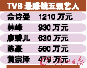 陈豪和廖碧儿也不介意以情侣档公开露面和合作,两人收入都在前5。而去年都入前5的郭晋安和胡杏儿,郭晋安因牵挂儿子而减少工作,胡杏儿因没有代表作,双双跌出5强。