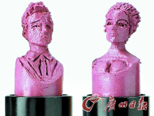对渴望用嘴唇亲密接触布拉德·皮特和安吉丽娜·茱莉的影迷来说,有办法了!因为45岁的皮特和33岁的茱莉双双赢得了美国某化妆品网站“最想亲吻的艺人”票选冠军,该网站特别委托微型雕塑家威拉德·维冈(Willard Wigan)为他们雕刻了头像口红做纪念。