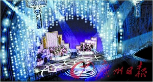 在这座纽约建筑师大维·洛克威尔设计的紫蓝色舞台上,装饰异常华丽,天花板上垂下的吊灯也闪闪发亮,为舞台增添幻想色彩。洛克威尔对此表示满意,认为这就是他设计概念中的那个“超现实风格的舞台”。
